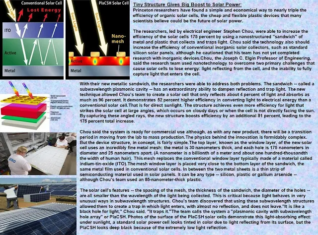The researchers, led by electrical engineer Stephen Chou, were able to increase the efficiency of the solar cells 175 percent by using a nano structured "sandwich" of metal and plastic that collects and traps light. Chou said the technology also should increase the efficiency of conventional inorganic solar collectors, such as standard silicon solar panels, although he cautioned that his team has not yet completed research with inorganic devices.