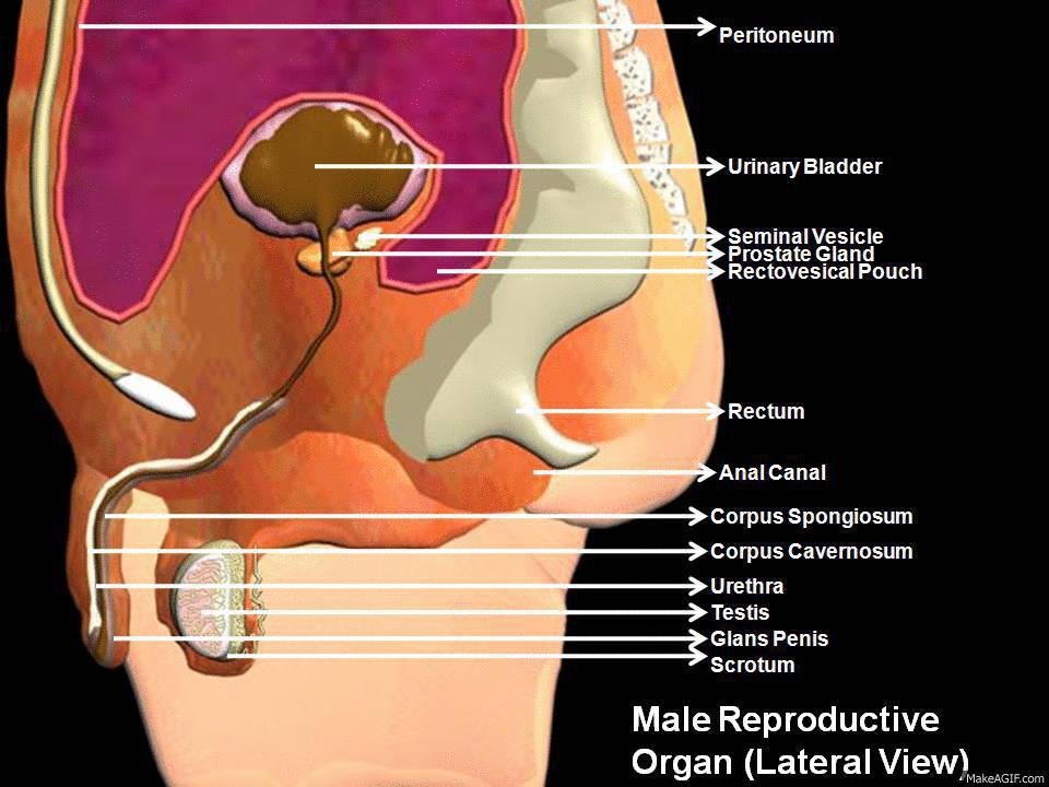 This lies in the pelvic cavity in front of the rectum and behind the symphysis pubis, surrounding the first part of the urethra.It consists of an outer covering, a layer of smooth muscle and glandular substance composed of columnar epithelium cells.It secrete a thin, milky fluid that makes up about 30 % of semen , and give its milky appearance.It contains a clotting enzymes, which thickens the semen in the vagina, increasing the likelihood of the semen being retained close to the cervix.