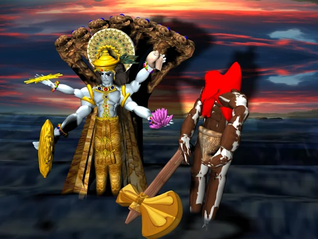 | BULL DEAMON ATTACKED LORD VISHNU WITH HIS LARGE AXE AND LORD COUNTER IT WITH HIS MACE OR GADHA |